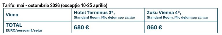 Locuri în limita disponibilității! Atenție, disponibilitatea se poate schimba în orice moment, motiv pentru care va rugăm să ne contactați pentru reconfirmarea tarifelor și / sau a locurilor disponibile!