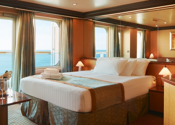 Cabina exterioara cu balcon are geamuri mari si o usa care se deschide, pe unde aveti accesul la balcon. Au un dormitor principal cu doua paturi de o persoana ce se pot uni, o baie privata cu cada cu hidromasaj si dus precum si un living dotat cu mobila si o canapea extensibila. Fiecare camera este dotata cu un televizor, aer conditionat cu termostat, telefon, uscator de par, mini bar, seif. Suprafata cabina: 20 mp.