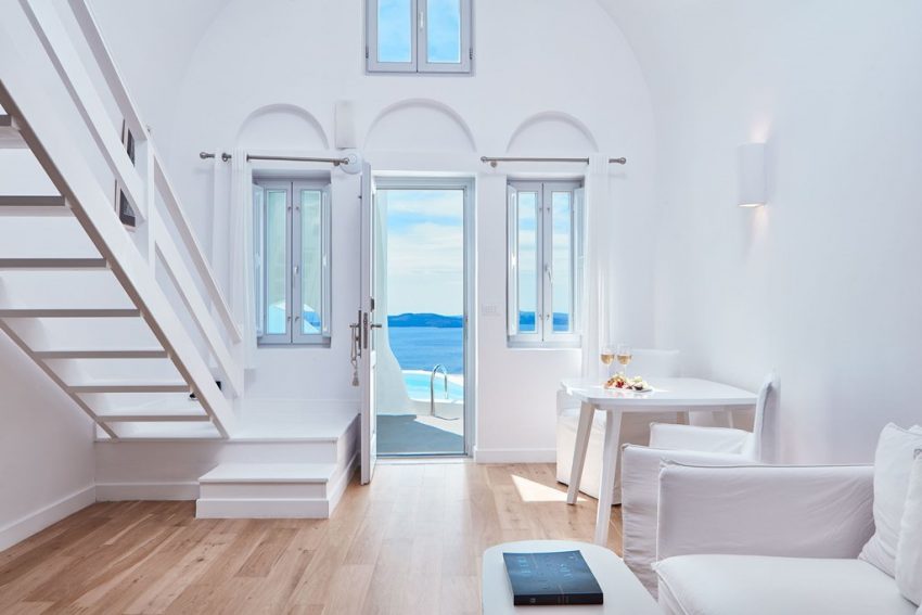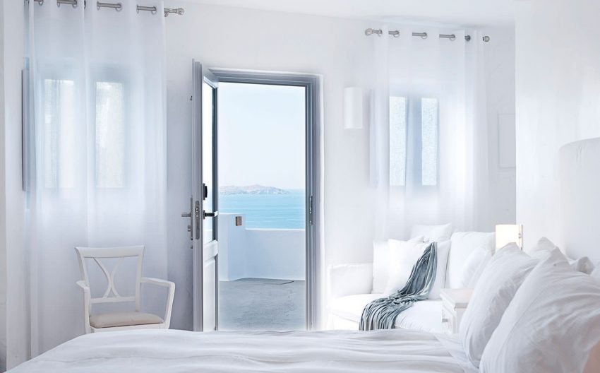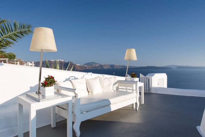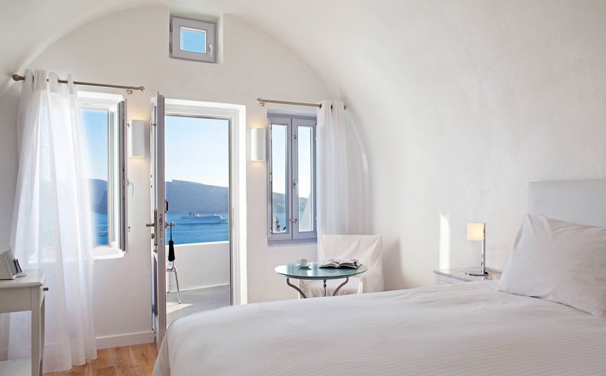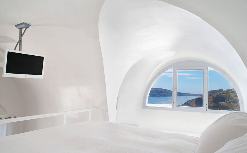 Fiecare dintre camerele zugrăvite în alb are terasă privată, cu vedere memorabilă la mare. Toate camerele sunt dotate cu aer condiţionat, TV prin satelit şi CD player. Oaspeţii au, de asemenea, la dispoziţie un minibar, o cramă mică şi un frigider.