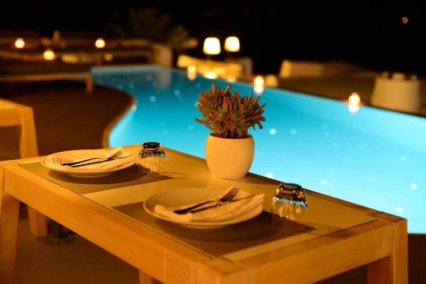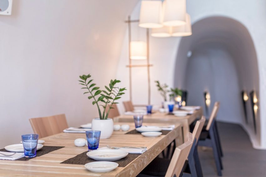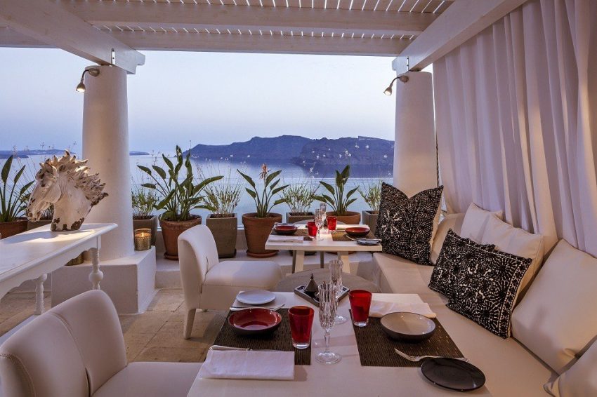Hotelul Katikies este situat pe stâncile din Oia, la 300 de metri deasupra apei albastre a Mării Egee şi oferă 2 restaurante: Seltz Champagne Restaurant & Bar și restaurantul Mikrasia. Piscinele sale infinite au vedere panoramică la caldeiră.