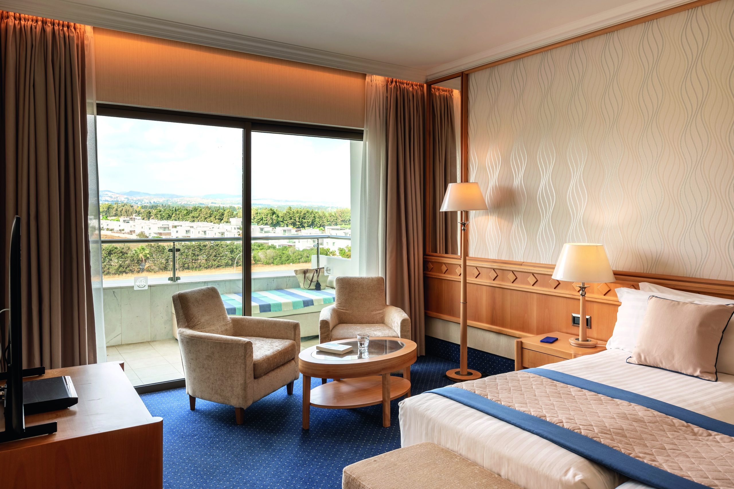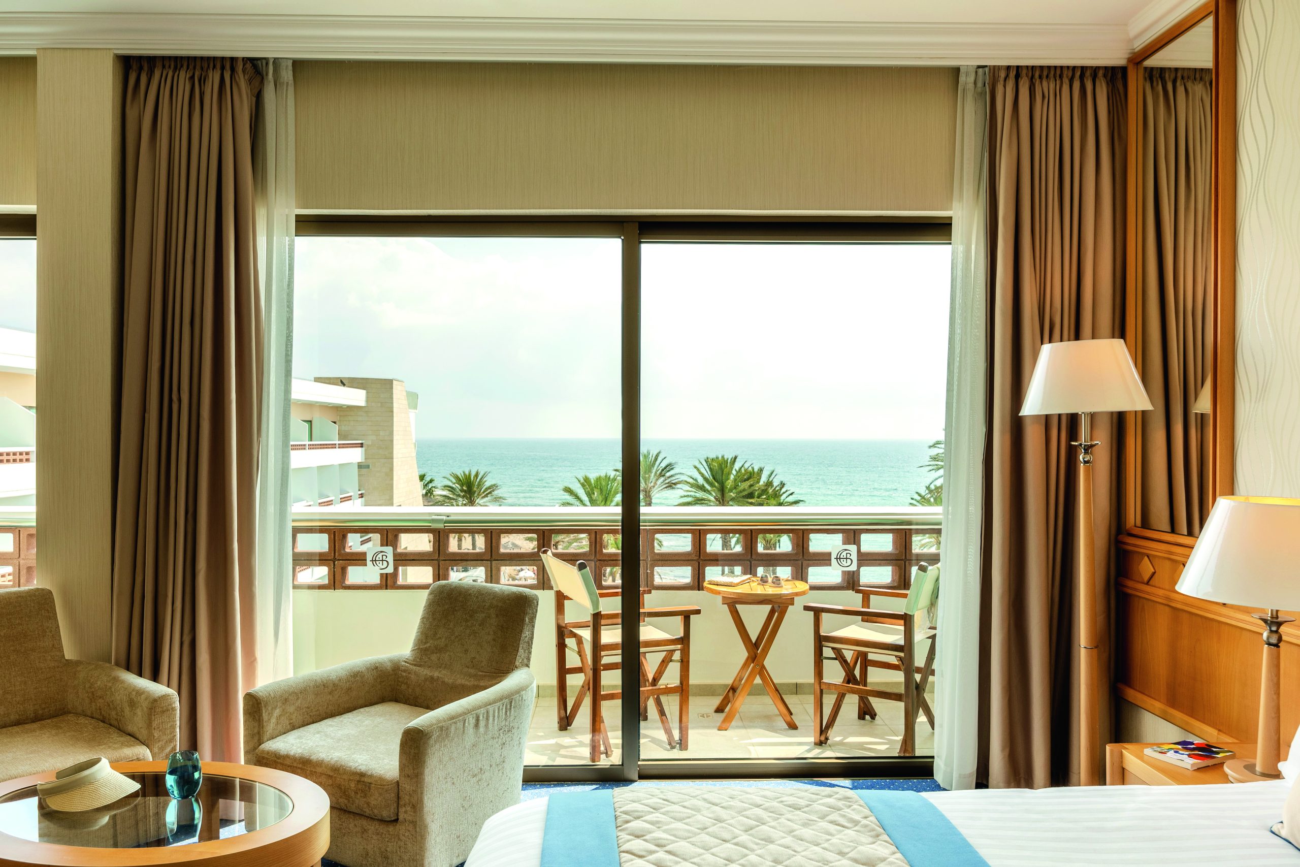 Hotelul dispune de camere și suite moderne, luminoase, decorate în tonuri naturale, multe dintre ele cu balcon și vedere la mare sau la grădinile amenajate. Fiecare cameră este gândită pentru confort, cu facilități contemporane care susțin o experiență de cazare relaxantă și lipsită de griji.